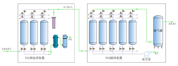在多晶硅生产过程中,三氯氢硅(SiHCl3)合成、氢还原和四氯化硅(SiCl4)氢化等工序中,副产的尾气,含有氢气(H2)、氯化氢(HCl)、二氯氢硅(SiH2Cl2)、三氯氢硅(SiHCl3)和四氯化硅(SiCl4)的尾气。我公司针对此种尾气气源进行实验研究,开发了氯硅烷和氯化氢专用吸附剂及配套的吸附分离工艺,可以将尾气中的氯硅烷、氯化氢以及氢气进行回收,净化后尾气中的氯硅烷含量降低到ppm乃至色谱检测不出,实现氯硅烷的循环利用,降低了原料消耗,提高企业的经济效益。采用该技术后,只需对流程适当调整,就可将氢气中的微量组分如CO、CO2、CH4、N2、O2等微量杂质脱除,大大提高氢气品质,使多晶硅的产品质量稳定提高。