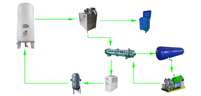 固体干冰是将液体二氧化碳注入干冰制造机并压缩制成,有砖状、柱状、块状和颗粒状等多种规格的产品。在干冰生产过程中,有大量液态二氧化碳气化,造成巨大的浪费。